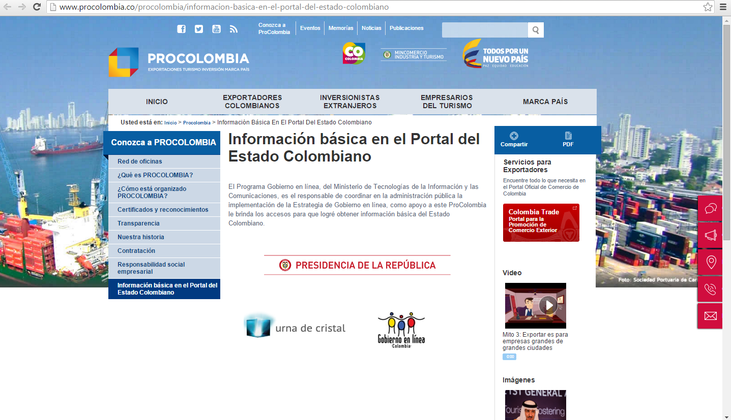 Acá encontramos la página de procolombia.co. Al entrar a este portal lo primero que me dio fue pereza al leer toda la información que hay allí, pues es fatigante tener que ir a mirar cosa por cosa para encontrar algo que se quiera buscar. Se entiende que es una página que no se presta mucho para tenerla más interactiva podríamos resumirle botones y ponerlo más directo a lo que el consumidor quiera llegar.